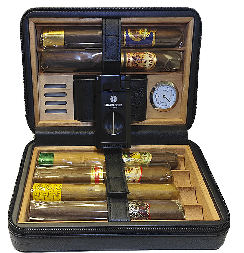 Комплектация набора: Дорожный хьюмидор на 6 сигар, зажигалка с пробойником и встроенной гильотиной, увлажнитель, гигрометр, 6 сигар